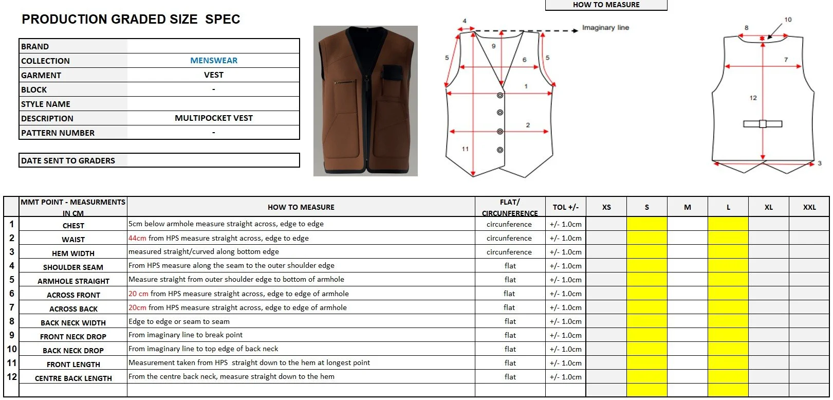 Exact measurements for every key point on the garment across all sizes — chest, body length, sleeve, shoulder, neck opening, hem. You also need tolerance levels and grading rules (the size increments between each size).